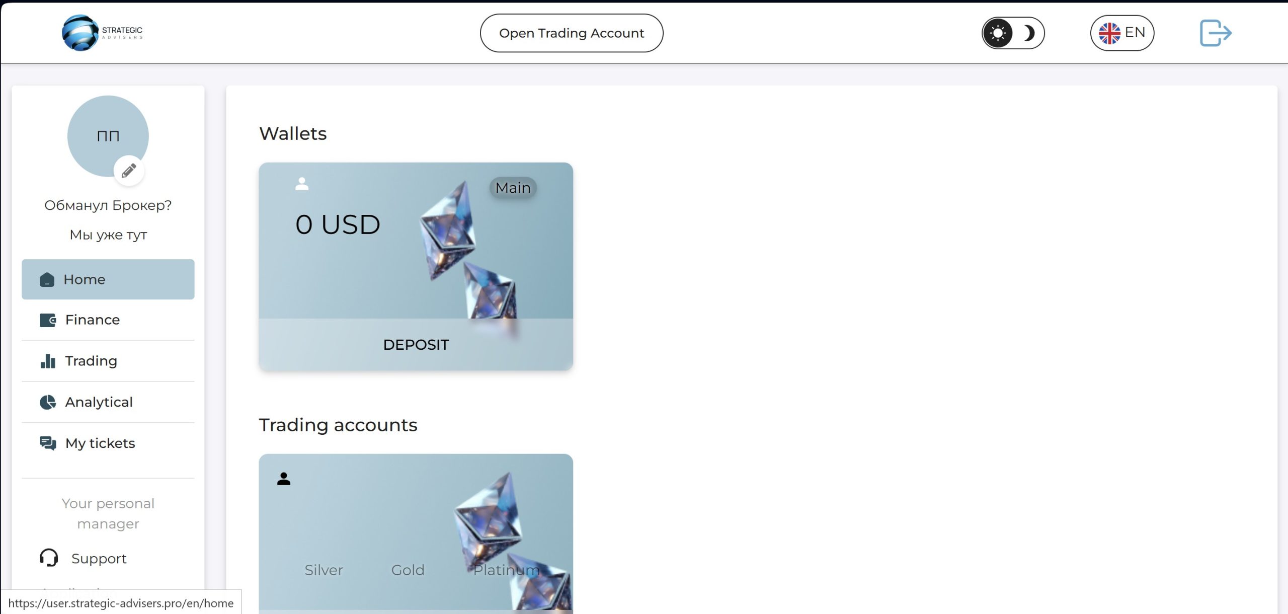 user.strategic-advisers.proилиstrategic-advisers.proпринадлежащий компании “Strategic advisers”, которая ведёт себя как брокер-мошенник — будьте крайне осторожны.